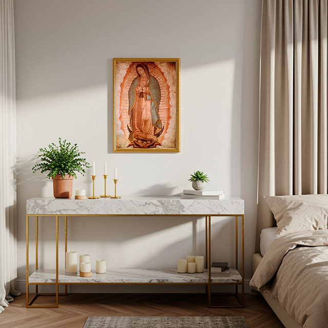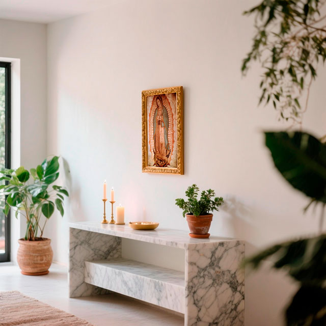 cuadro de la Virgen de Guadalupe chica decorando consola de mármol en entrada moderna con plantas naturalesCuadro de la Virgen de Guadalupe Chica (60×37.5 cm)